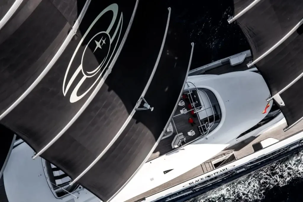 Il Black Pearl è immediatamente riconoscibile per il suo sistema di vele DynaRig, sviluppato originariamente per il celebre Maltese Falcon. Le tre imponenti alberature in carbonio, alte oltre 70 metri, sostengono un piano velico di circa 2.900 metri quadrati, che può essere dispiegato in meno di sette minuti. Questo sistema non solo garantisce performance eccezionali a vela, ma riduce drasticamente il fabbisogno di carburante, rendendo lo yacht una delle imbarcazioni più sostenibili della sua categoria.